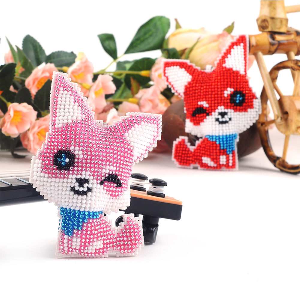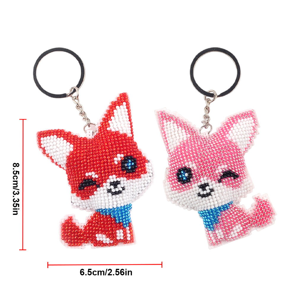 2Pcs Red Pink Fox - Stamped Bead Embroidery - Keychain