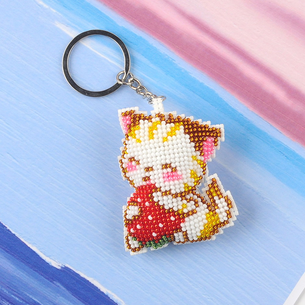 2Pcs Strawberry Cat - Stamped Bead Embroidery - Keychain
