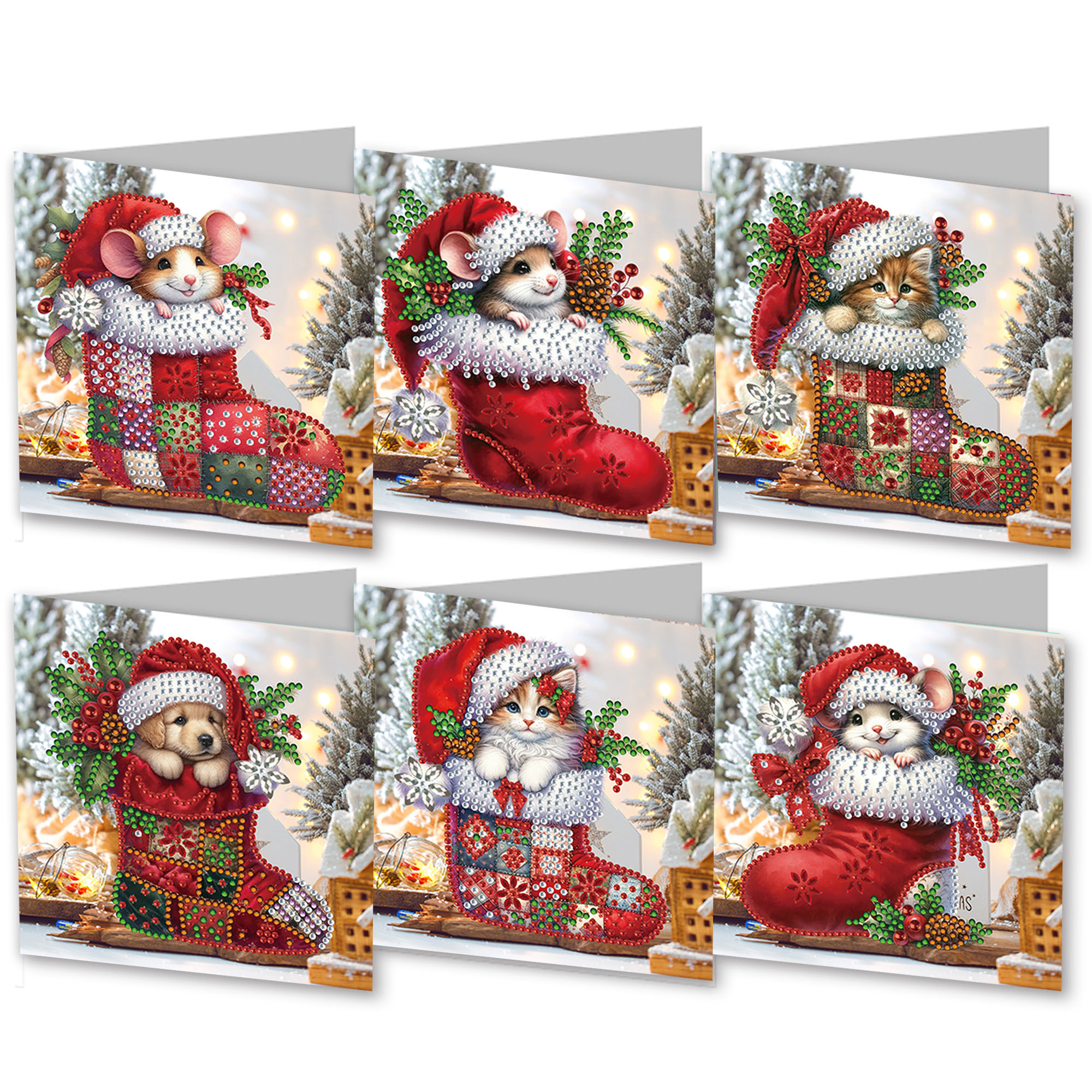 6pcs DIY Christmas Sock Animal DIY Diamond Painting Greeting Card for Friends Family Gift【With White Envelope】