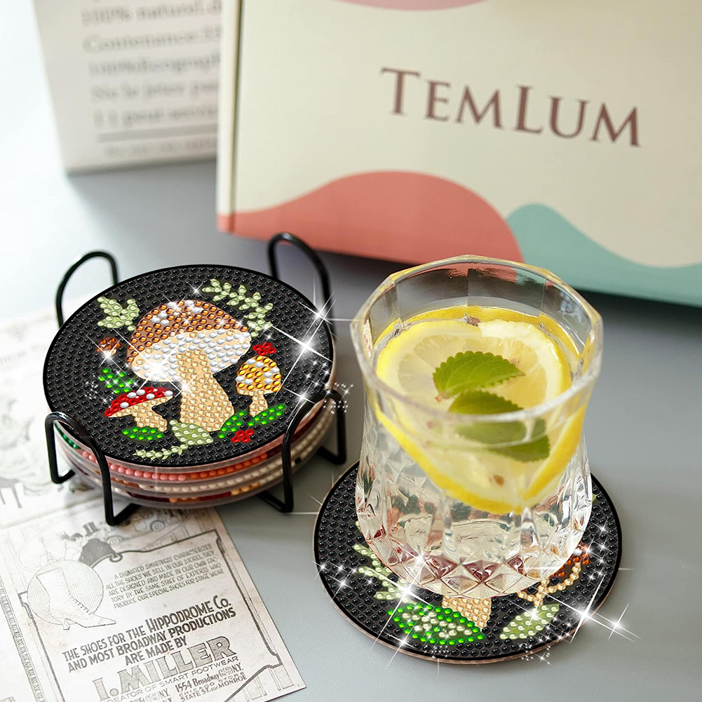 6pcs DIY Mushroom Acrylic Diamond Painting Coasters with Holder Cork Pads