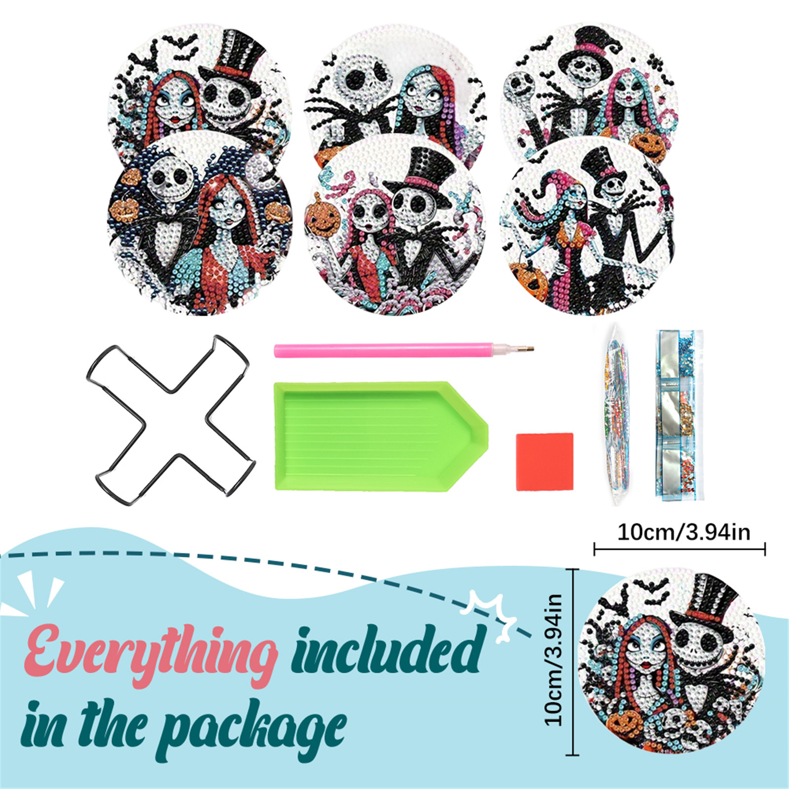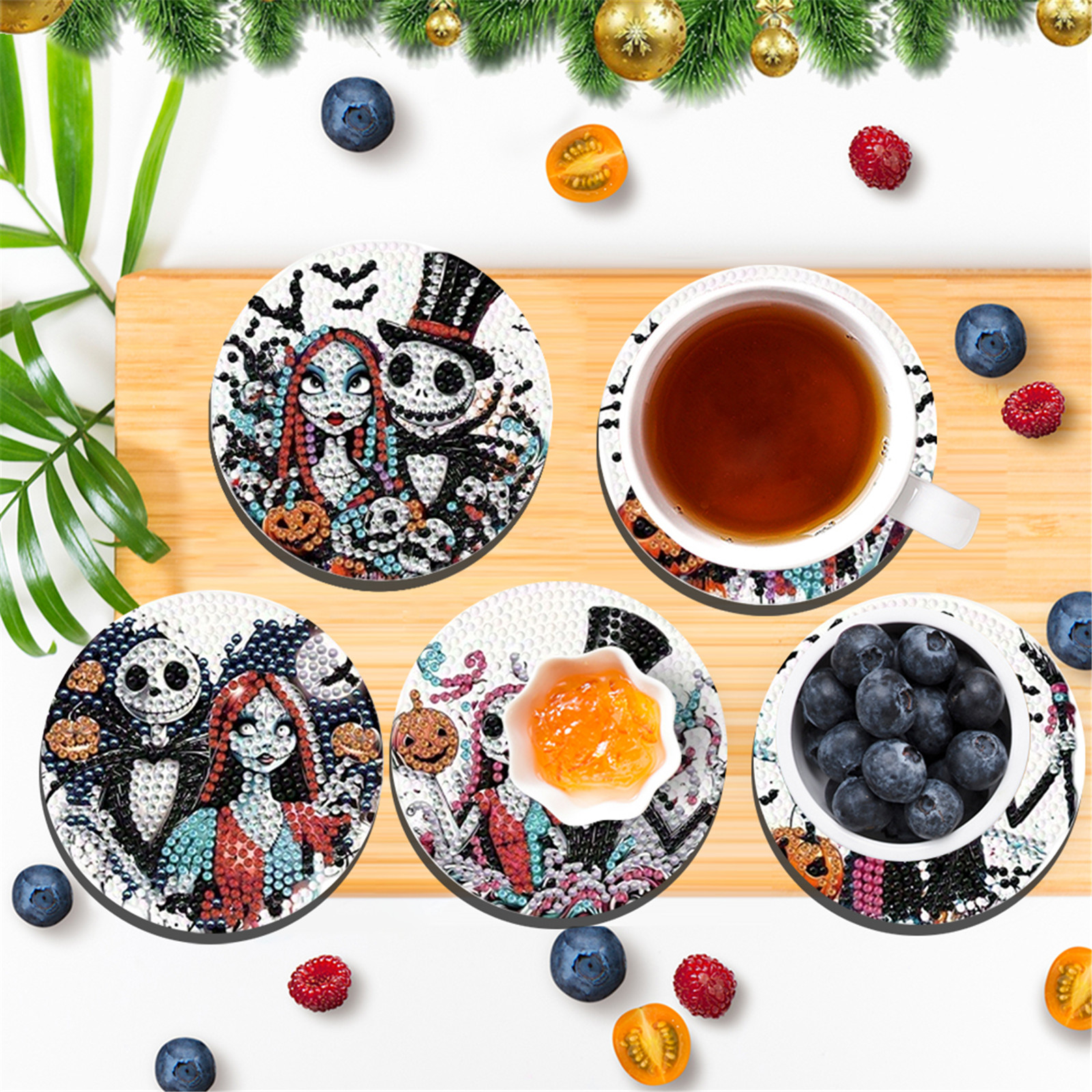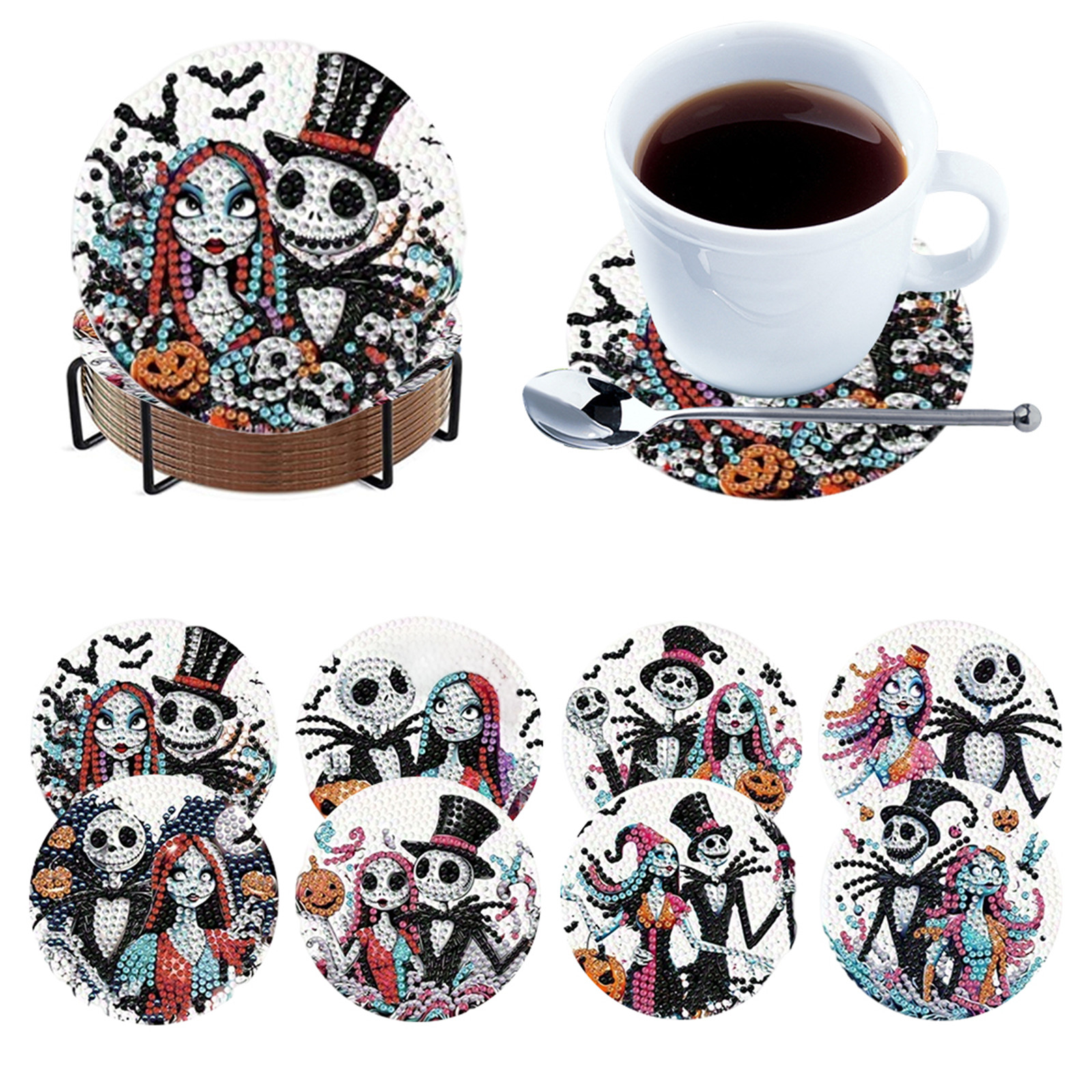 8pcs Cartoon DIY Diamond Painting Wooden Coasters Kits with Holder (Skeleton)