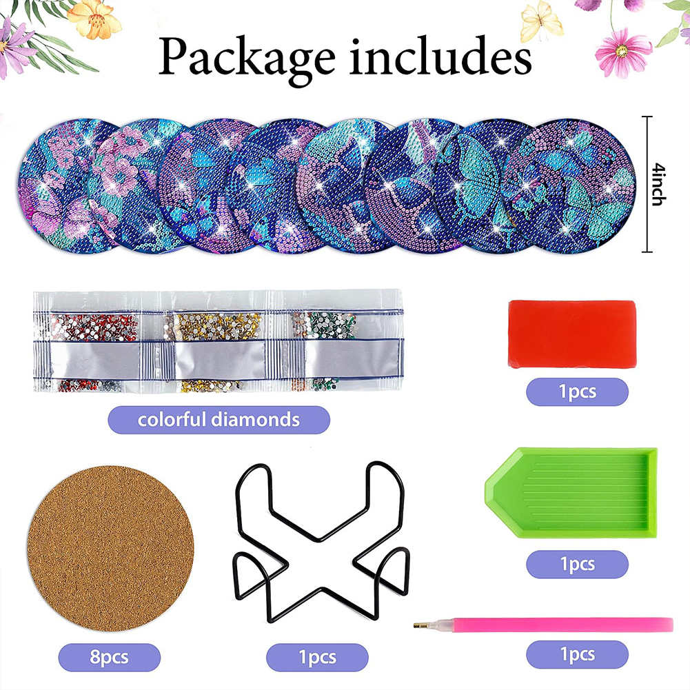 8pcs DIY Purple Butterfly Diamond Painting Coasters Kits Acrylic Full Drill Coaster Single Side Diamond