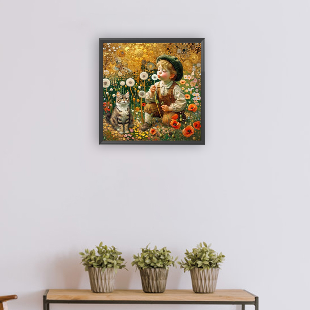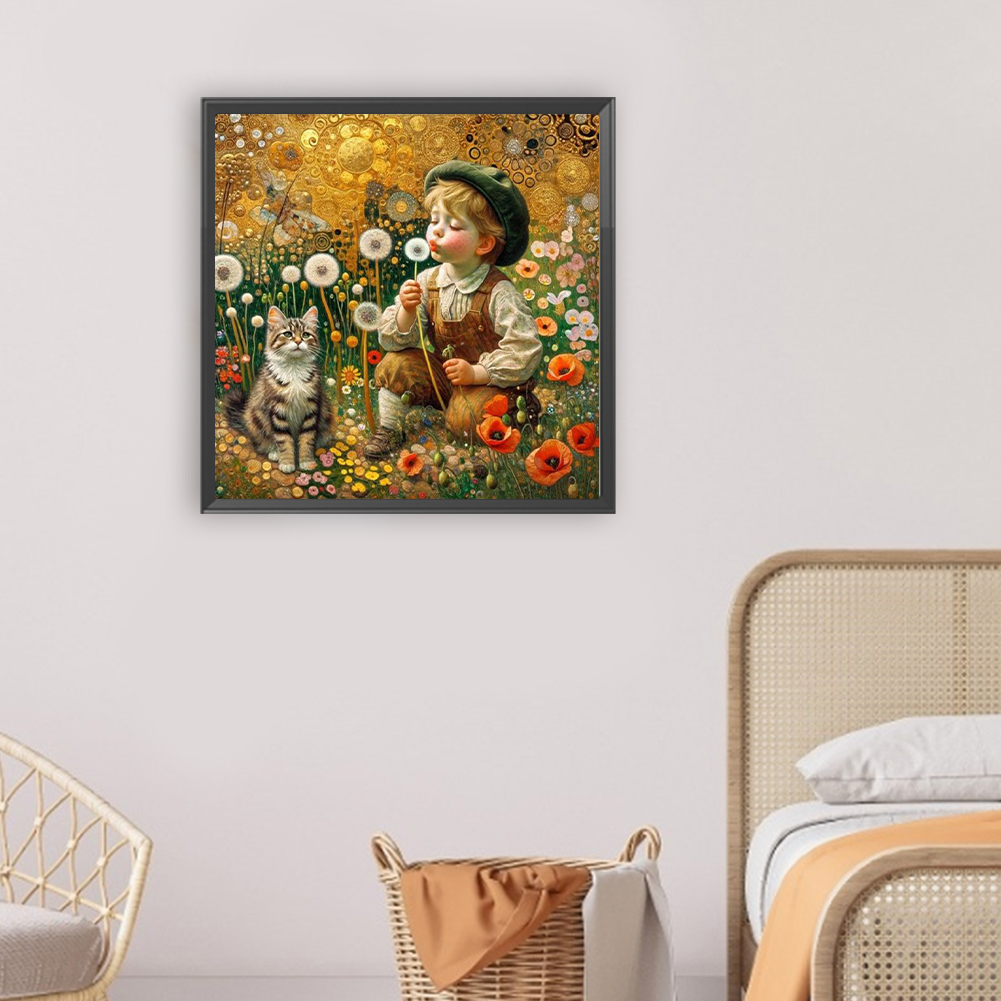 Full Round Diamond Painting 30*30cm - Child, Kitten And Dandelions