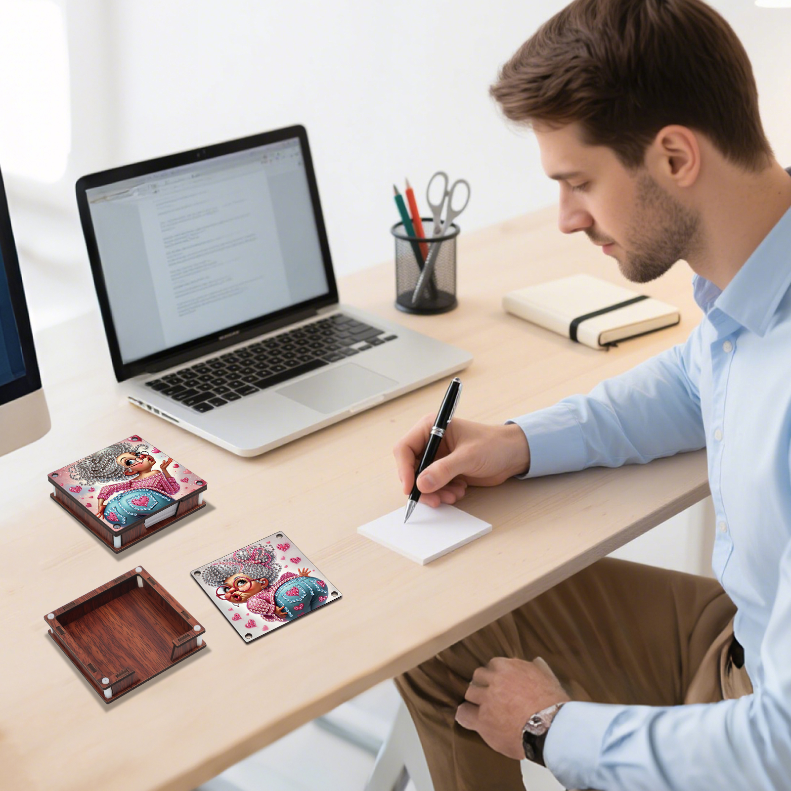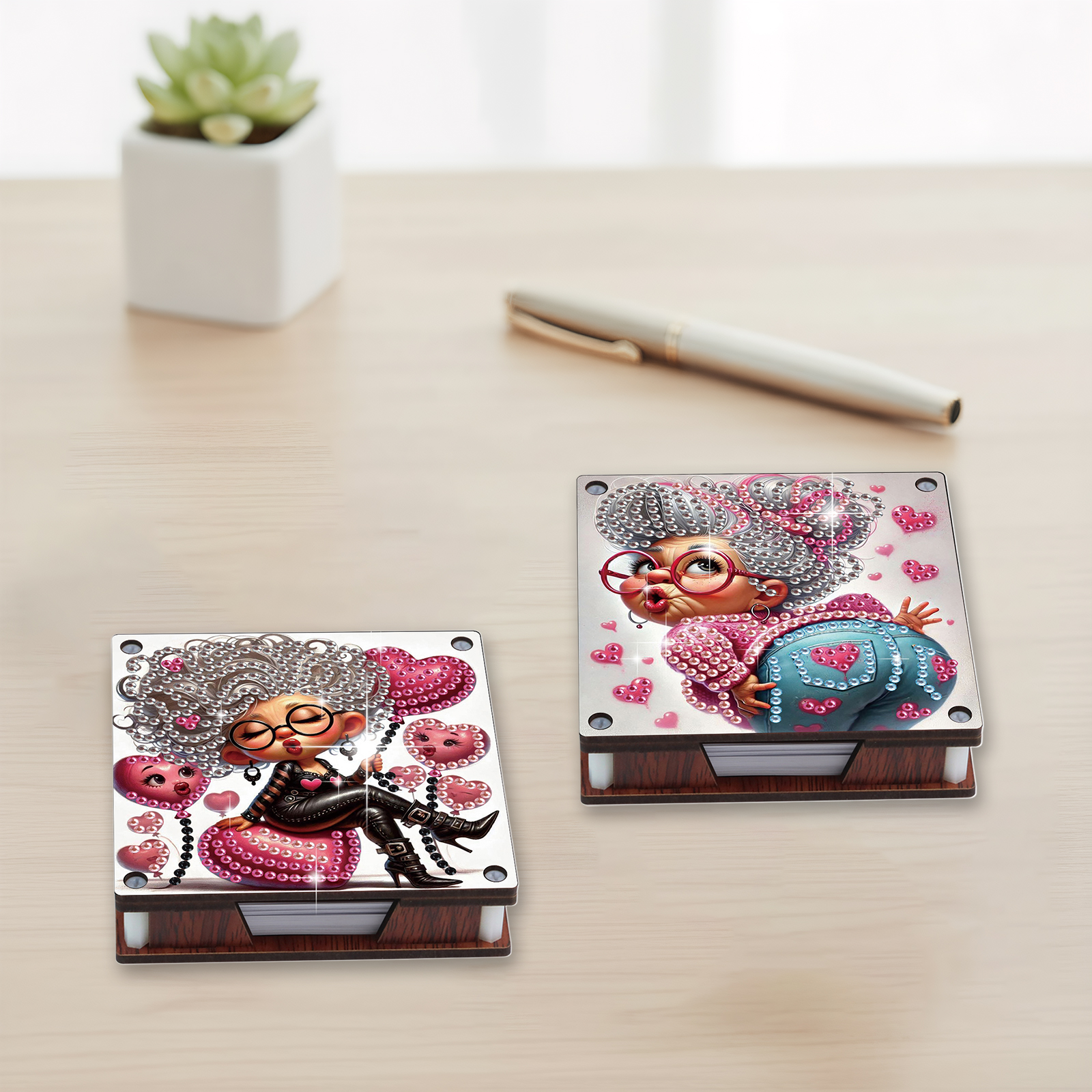 4pcs Wooden DIY Funny Old Lady Diamond Painting Kit Note Box with 480 Papers