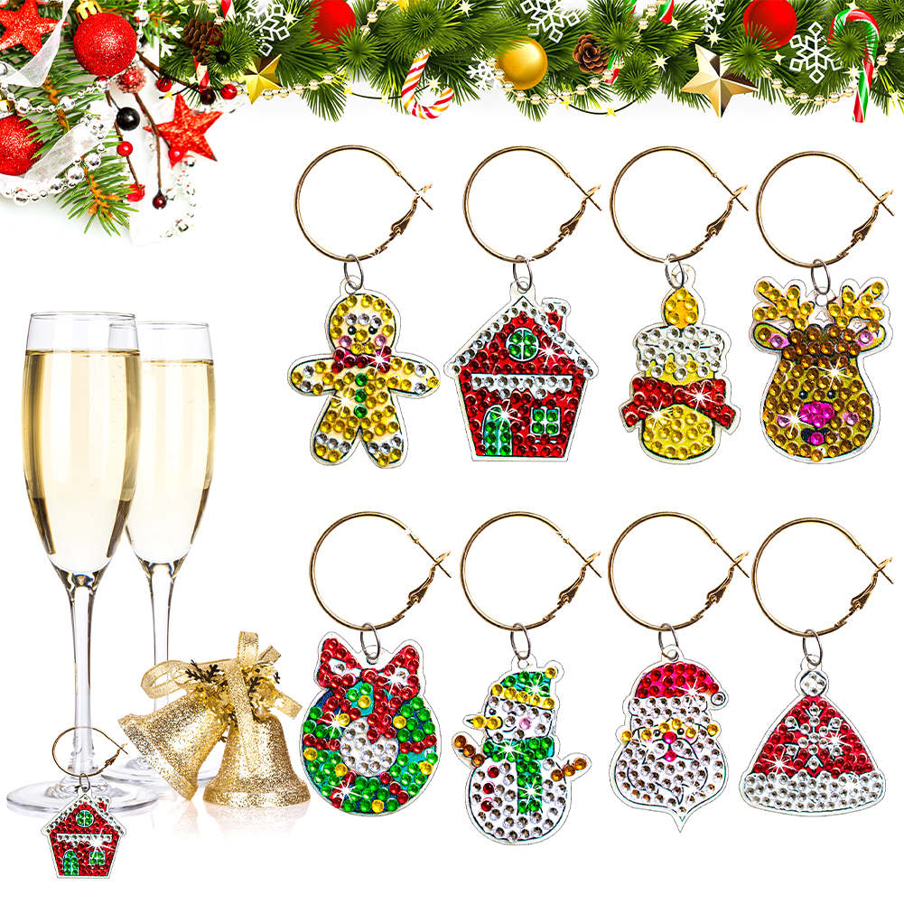 8pcs Diamond Painting Art Pendant Santa Diamond Wine Glass Charms Snowman Wreath