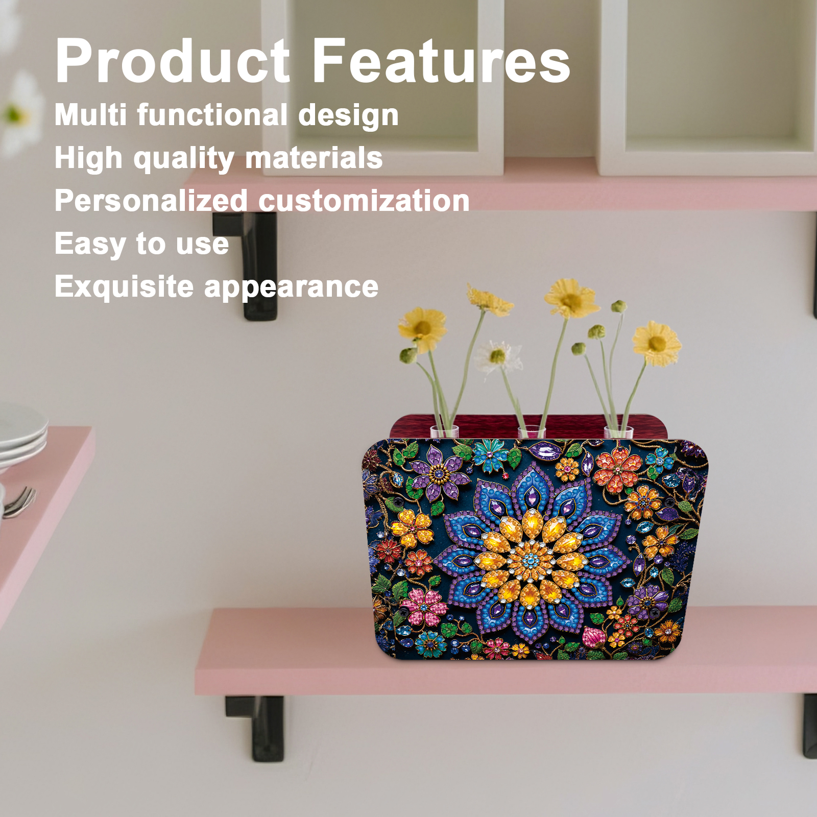 This DIY diamond painting project features a rhinestone vase. Once completed, display it anywhere to bring joy and creativity to you, your family, or friends!