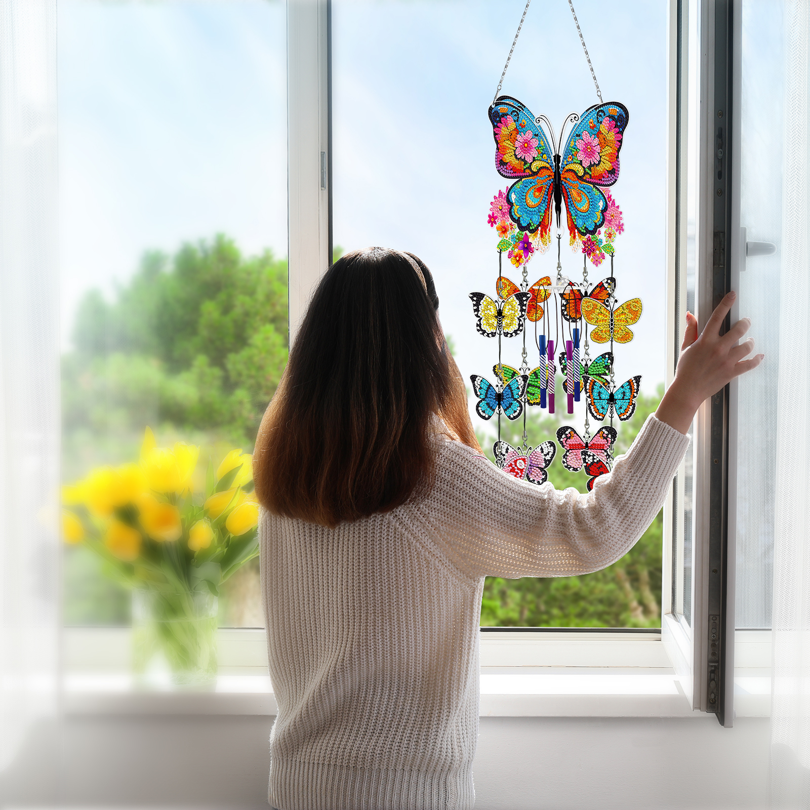 DIY Flower Butterfly Double Side Wind Chime Diamond Art Hanging Pendant Home Decor