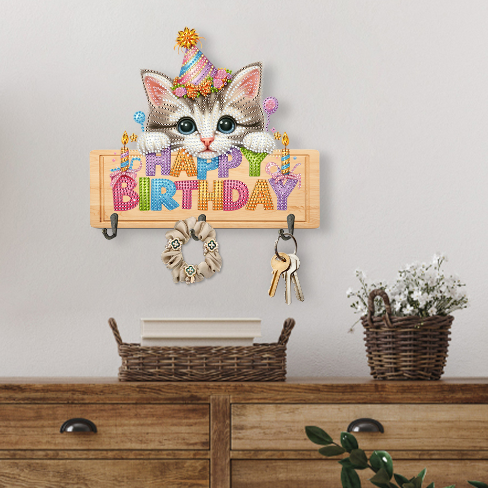 DIY Happy Birthday Cat Wooden Special Shape 3 Hooks No Punch Diamond Painting Hook Rail