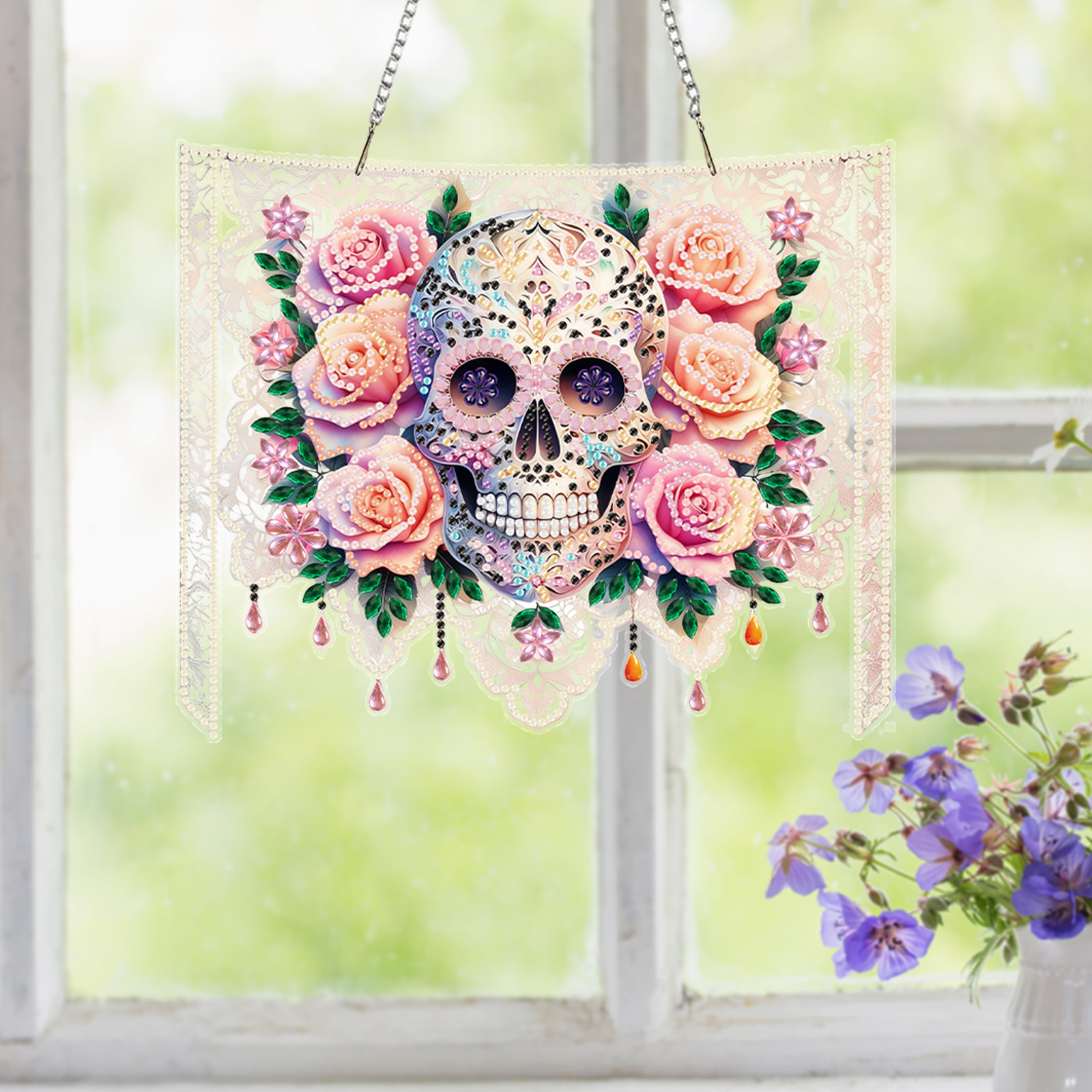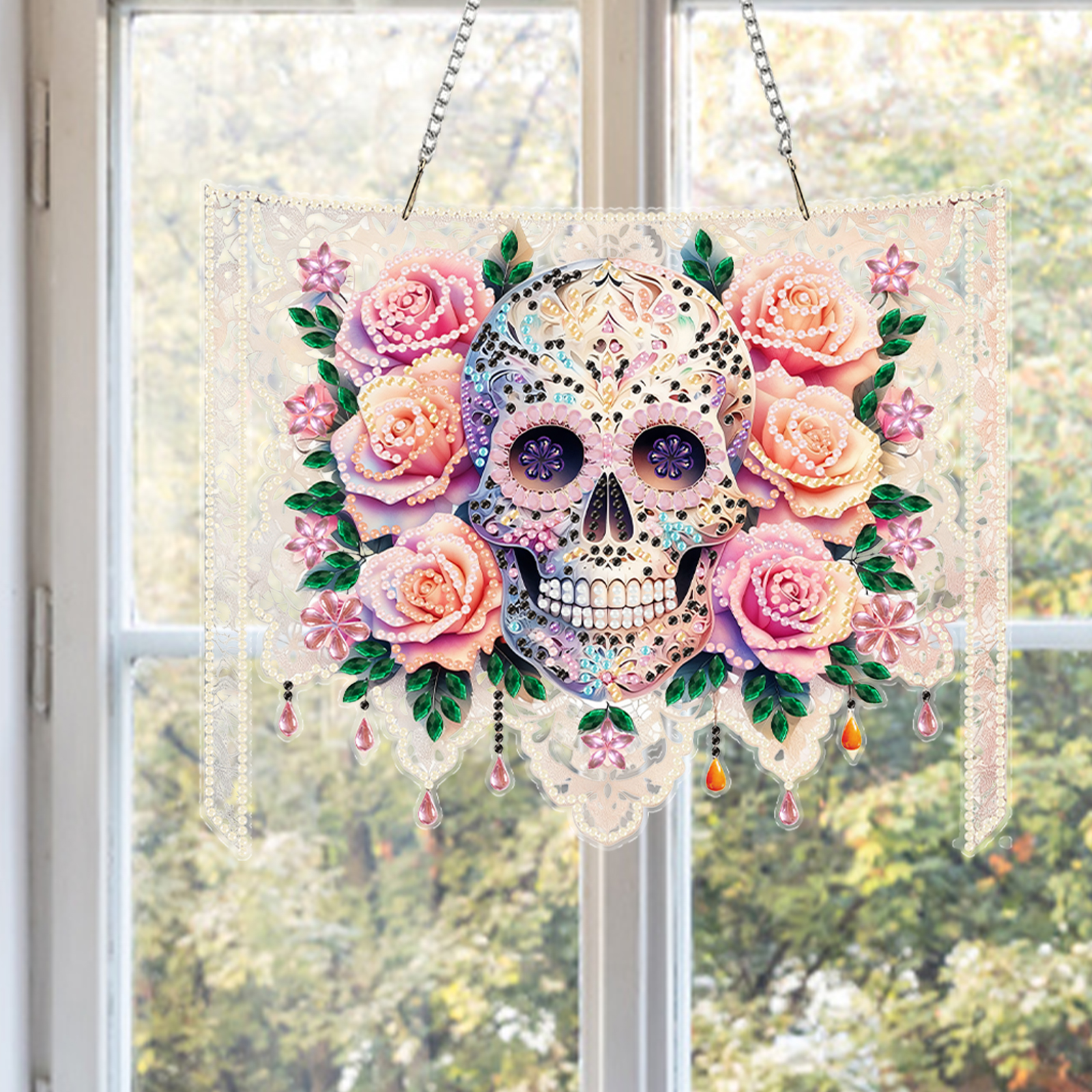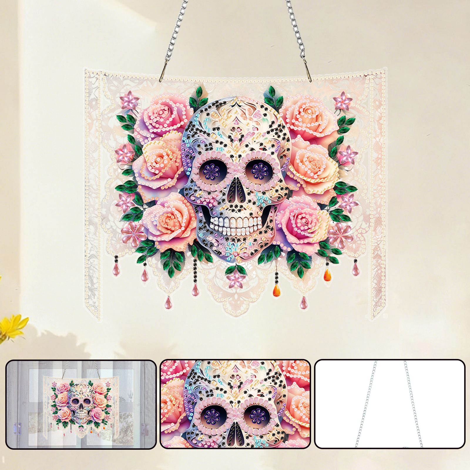 Skulls Flower 2D Flat DIY Acrylic Diamond Painting Kit Window Hanging Wall Decor