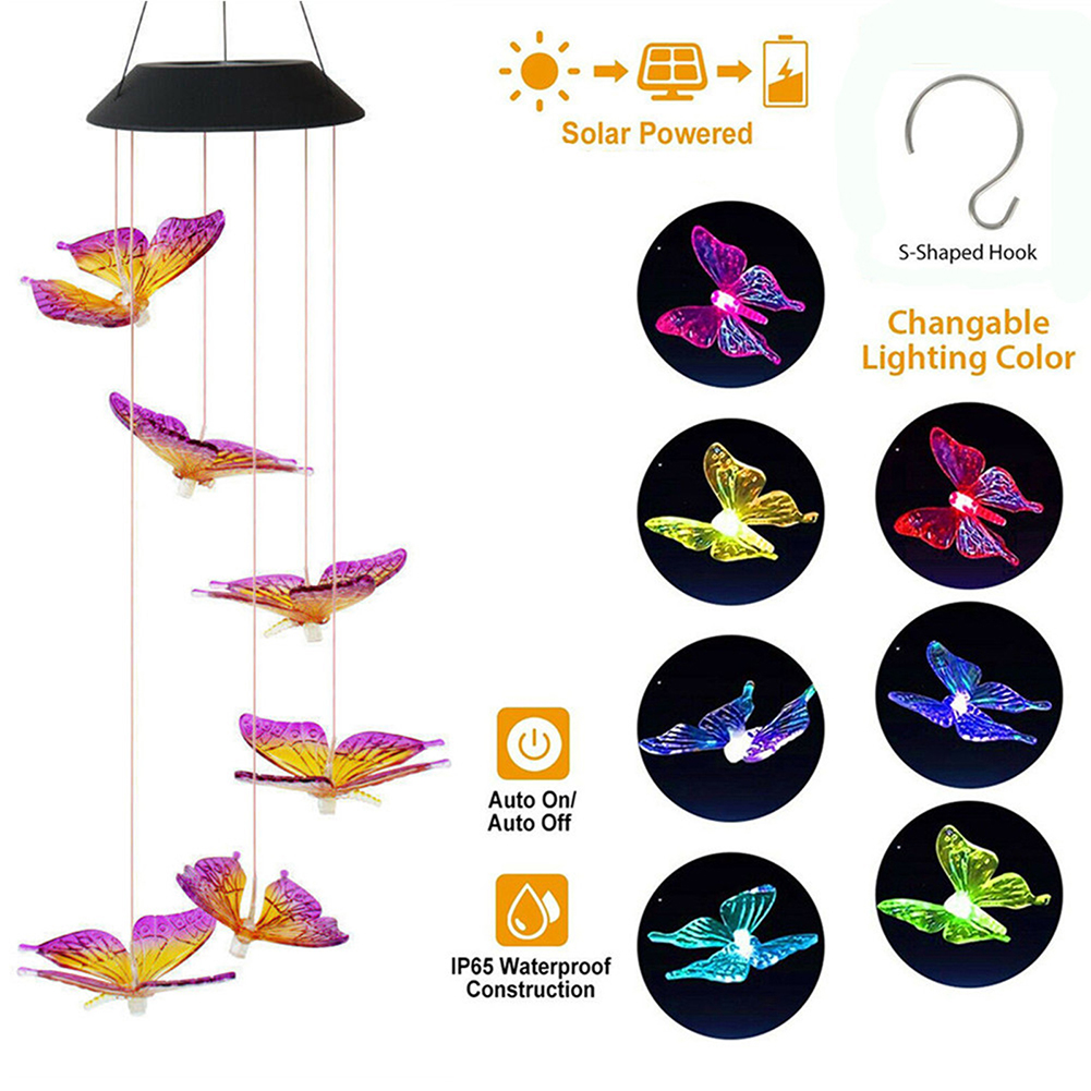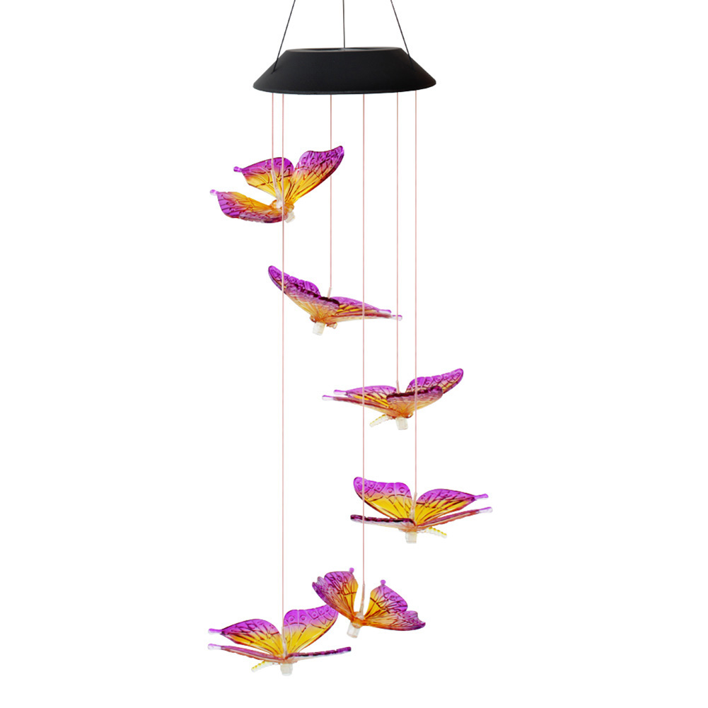 The butterfly solar LED wind chime is a decorative light that uses solar energy to supply power and is composed of a number of LED lights.