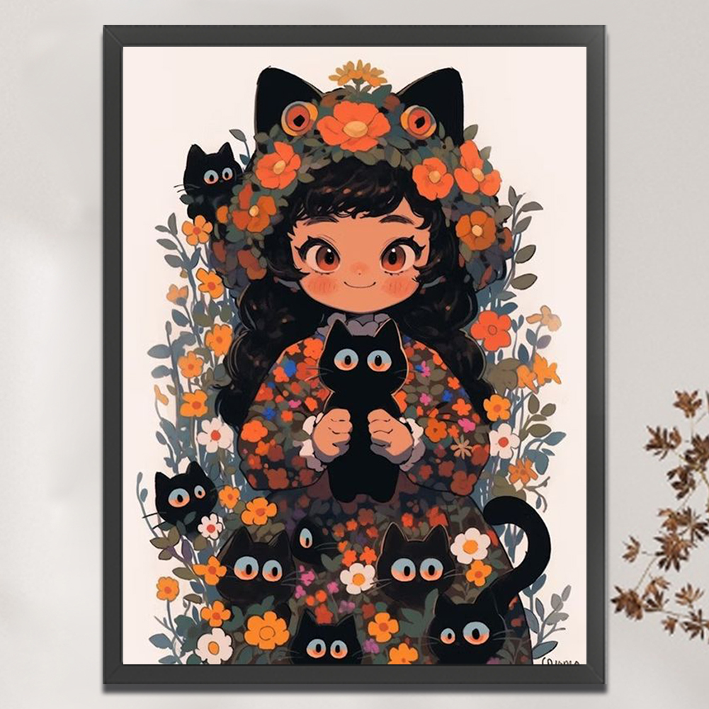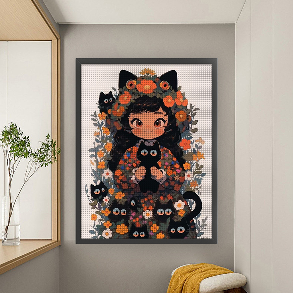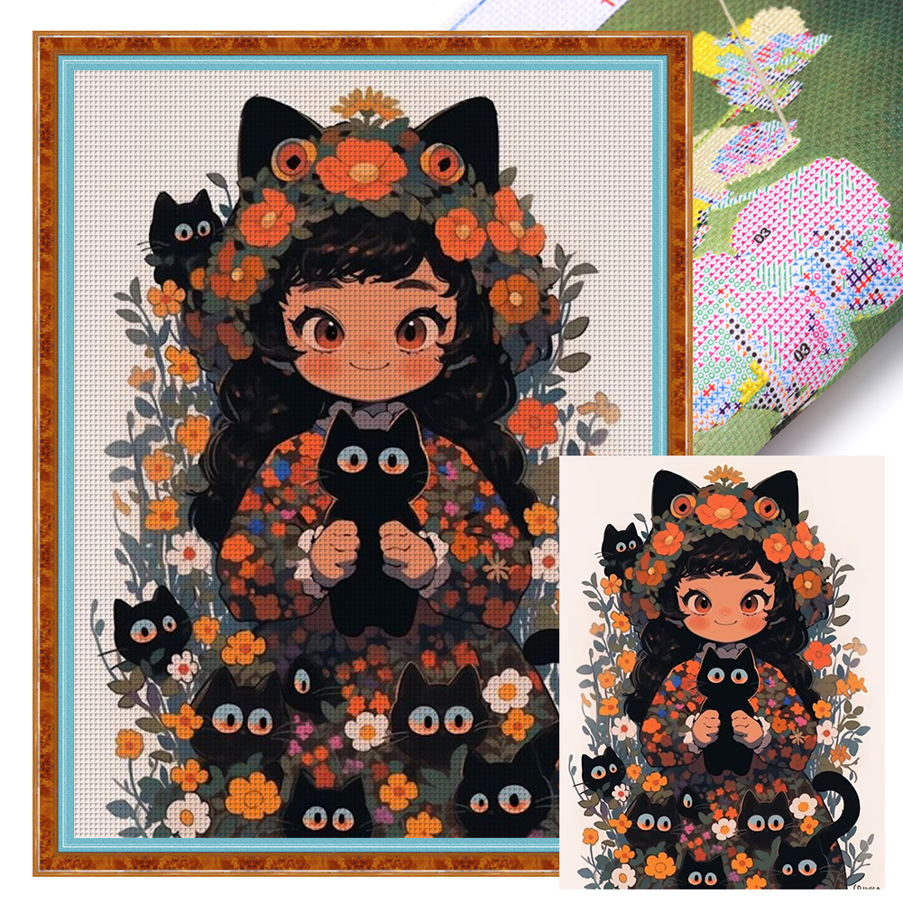 11CT Full Stamped Cross Stitch - Black Cat and Girl(Canvas|45*60CM)
