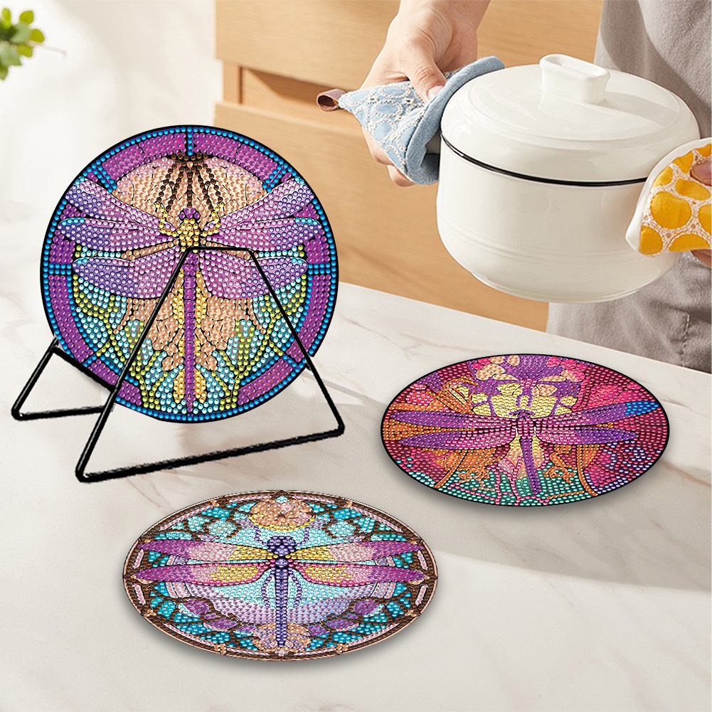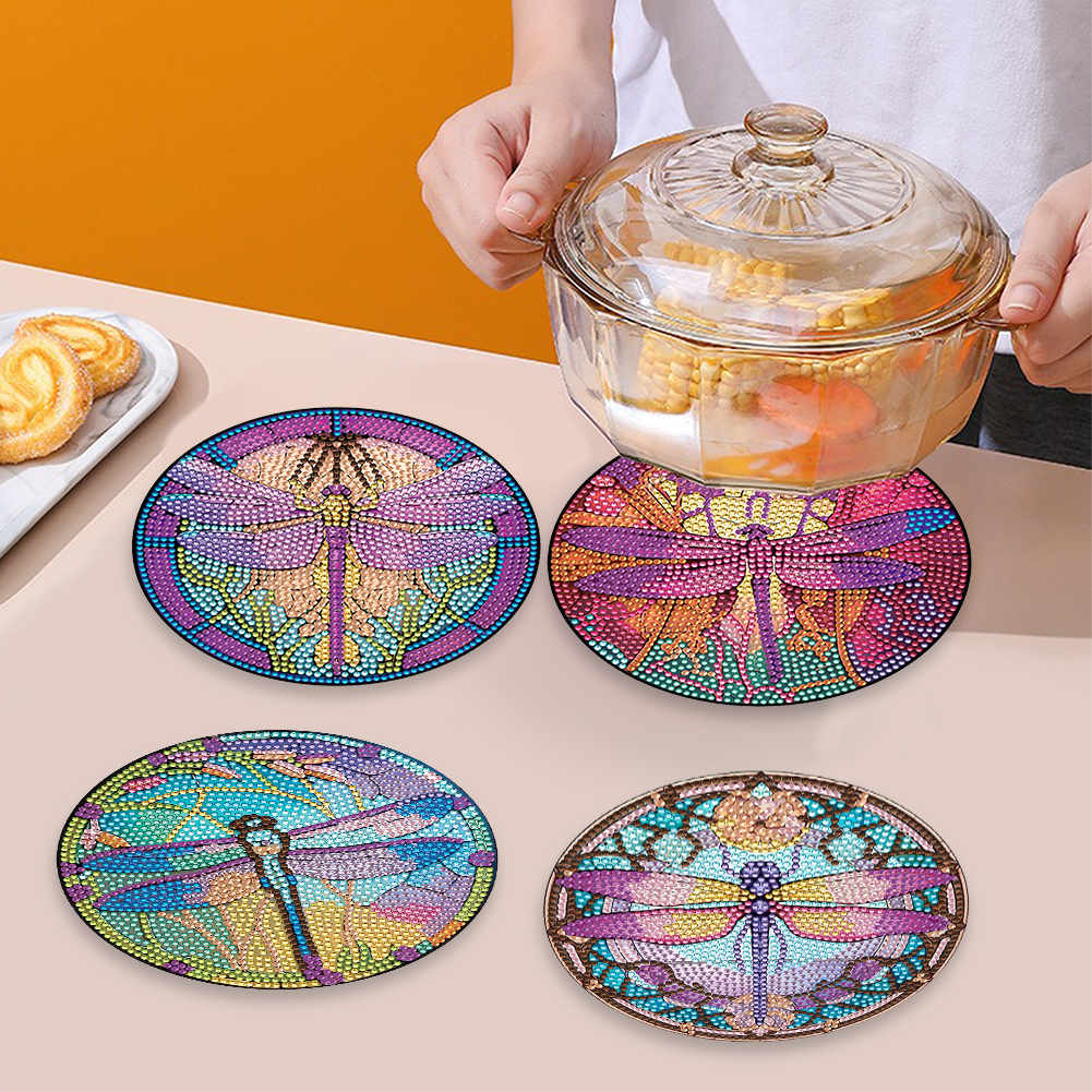 4pcs DIY Dragonfly Wooden Diamond Painting Placemats Kitchen Dish Mat with Holder