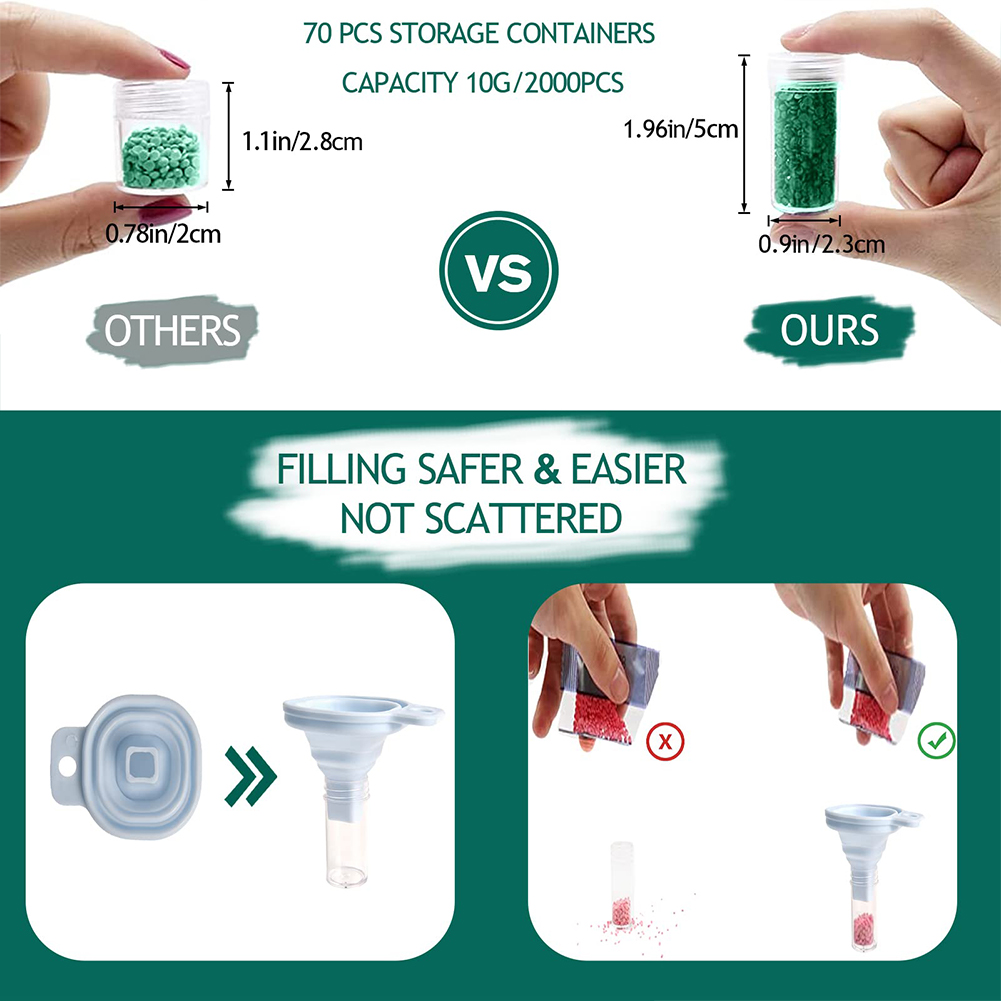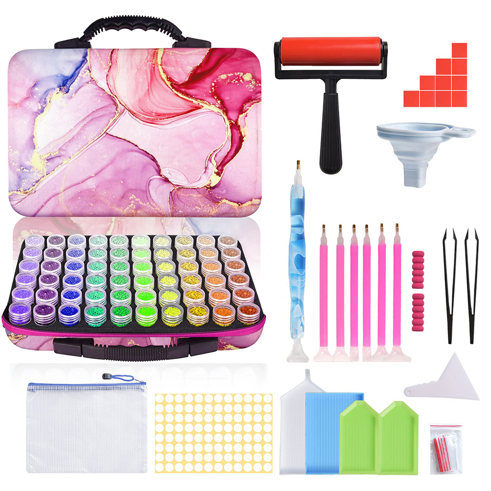 Packing List: Storage Bag*1+Bottle*70+Glue*10+Roller*1+Funnel*1+Resin Dot Drill Pen*1+Plastic Dot Drill Pen*6+Pen Cap*2+Tweezers*2+Corrector*1+Drill Plate*4+Opp Bag*20+Round Label Sticker*1+Zipper Bag*1