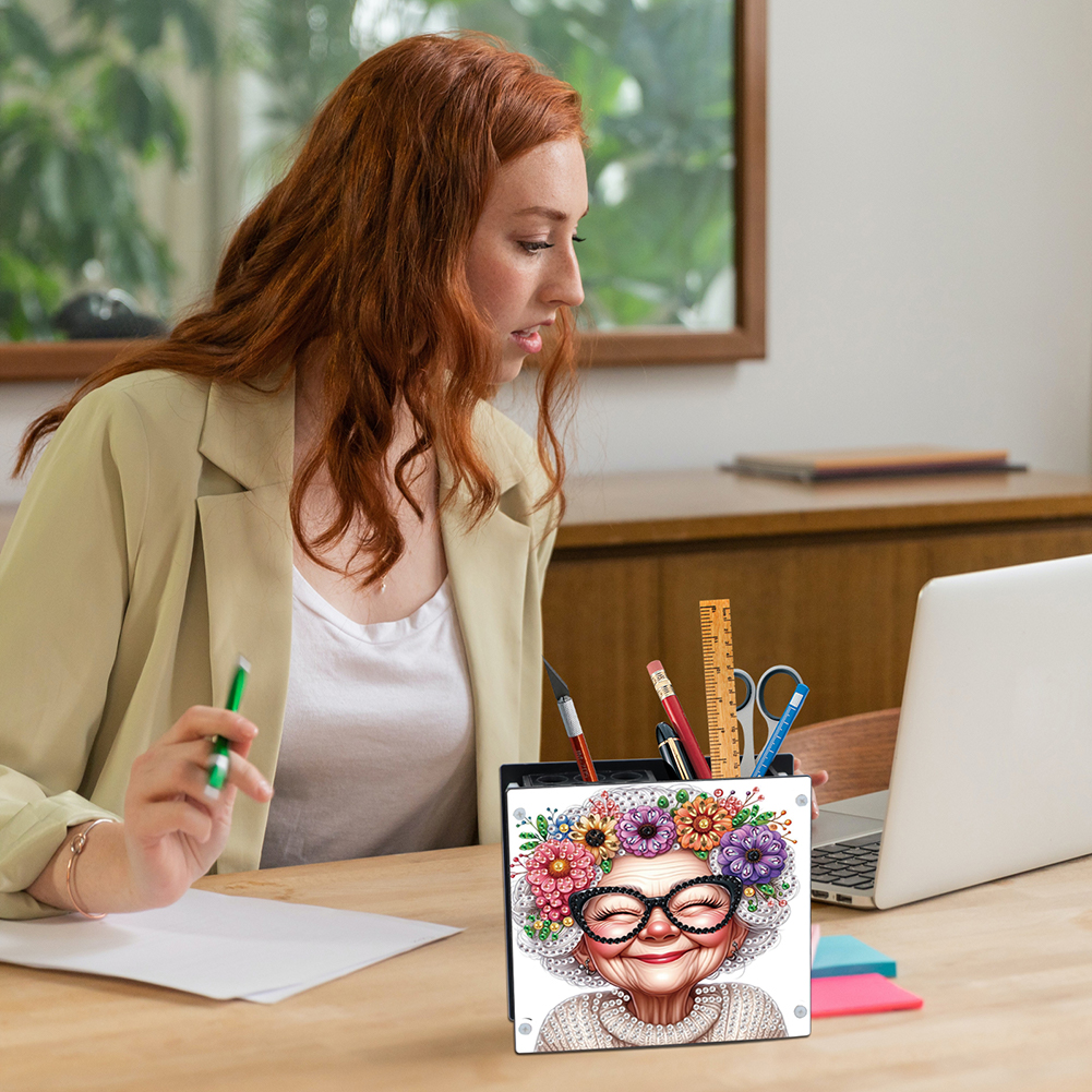 DIY Old Lady Special Shaped Diamond Painting Acrylic Pencil Holder Organizer