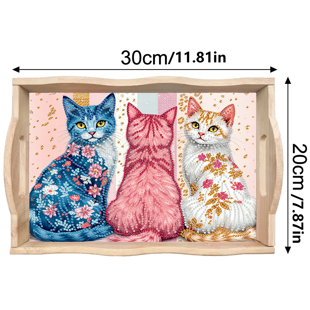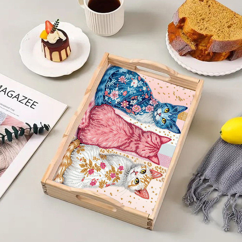 5D DIY Cat Diamond Painting Wooden Serving Tray with Handle for Desk