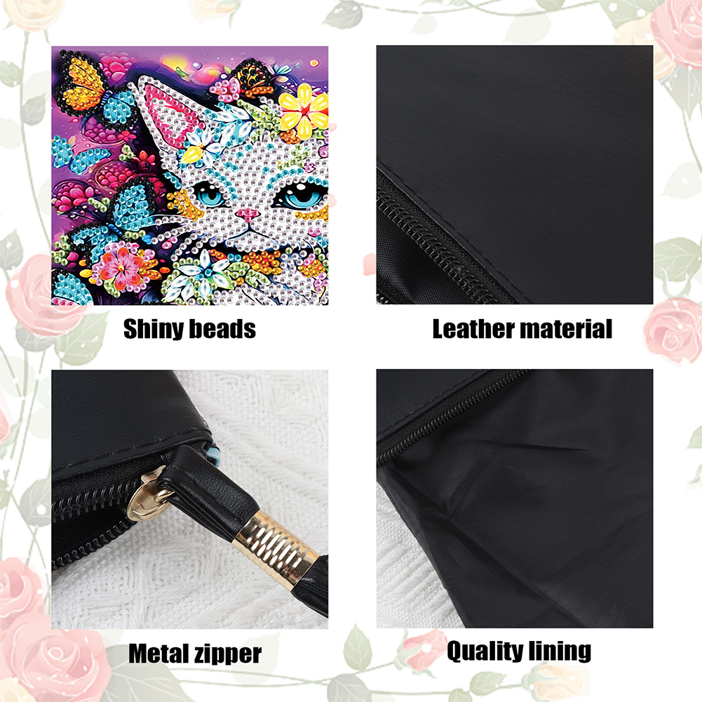 DIY Butterfly Cat PU Partial Special Shaped Diamond Painting Wallet Makeup Bag