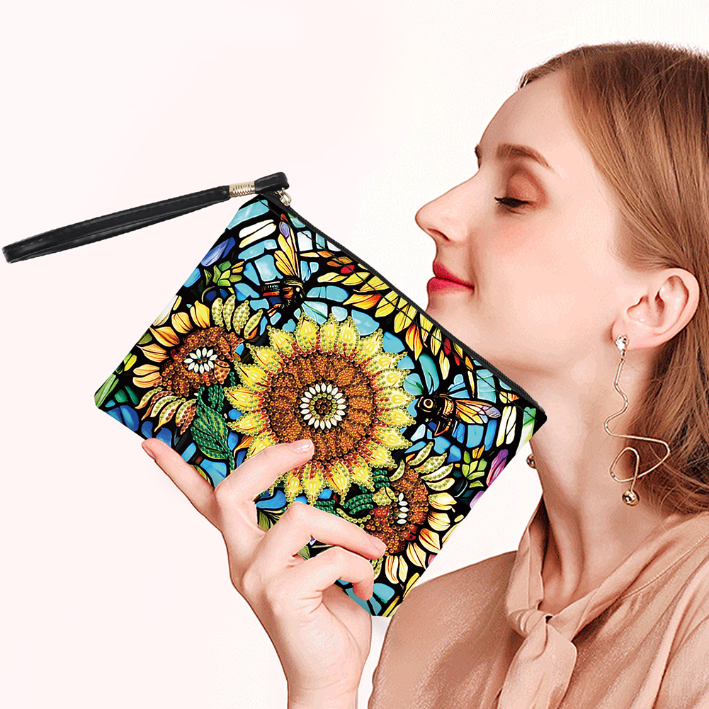 DIY Sunflower PU Partial Special Shaped Diamond Painting Wallet Makeup Bag