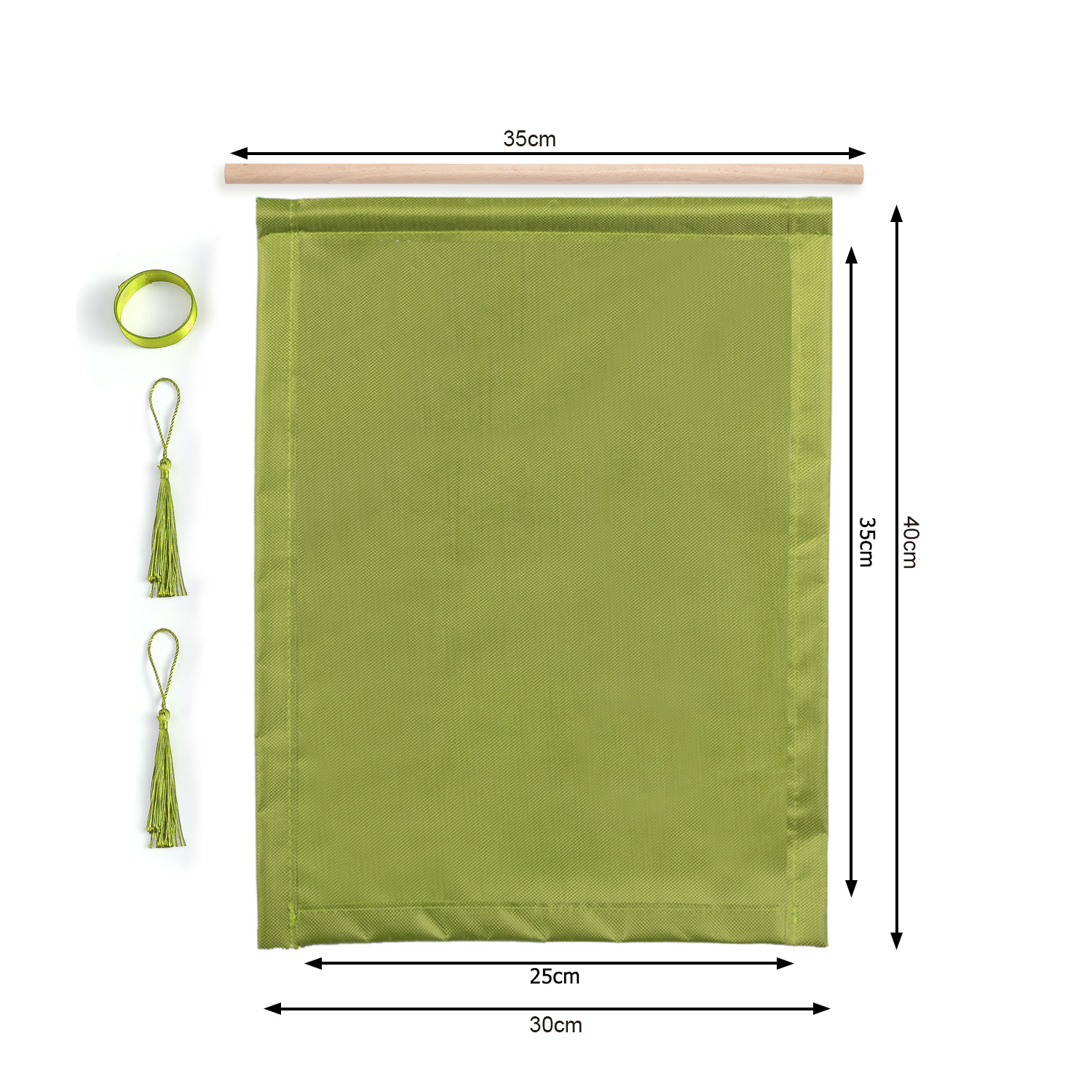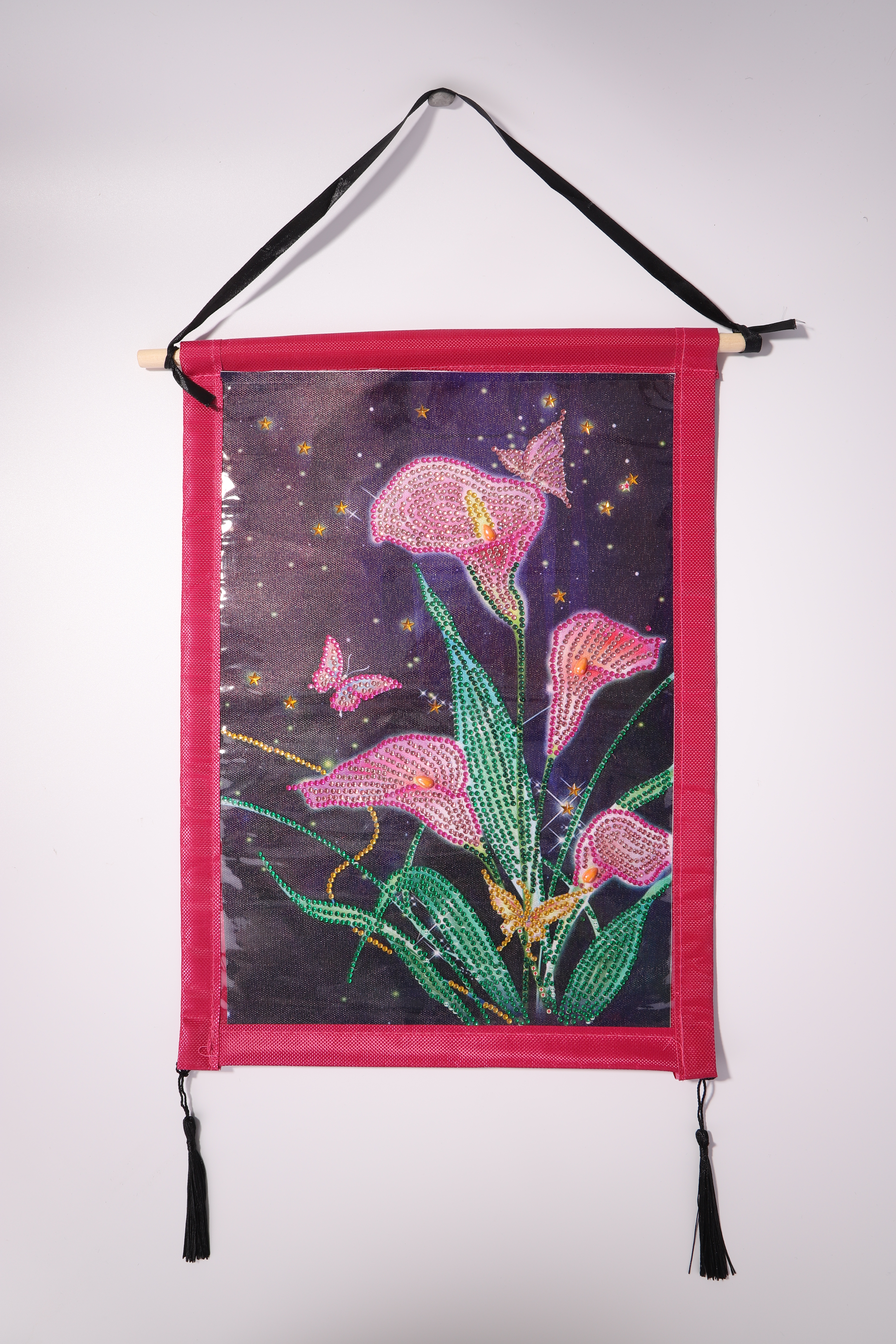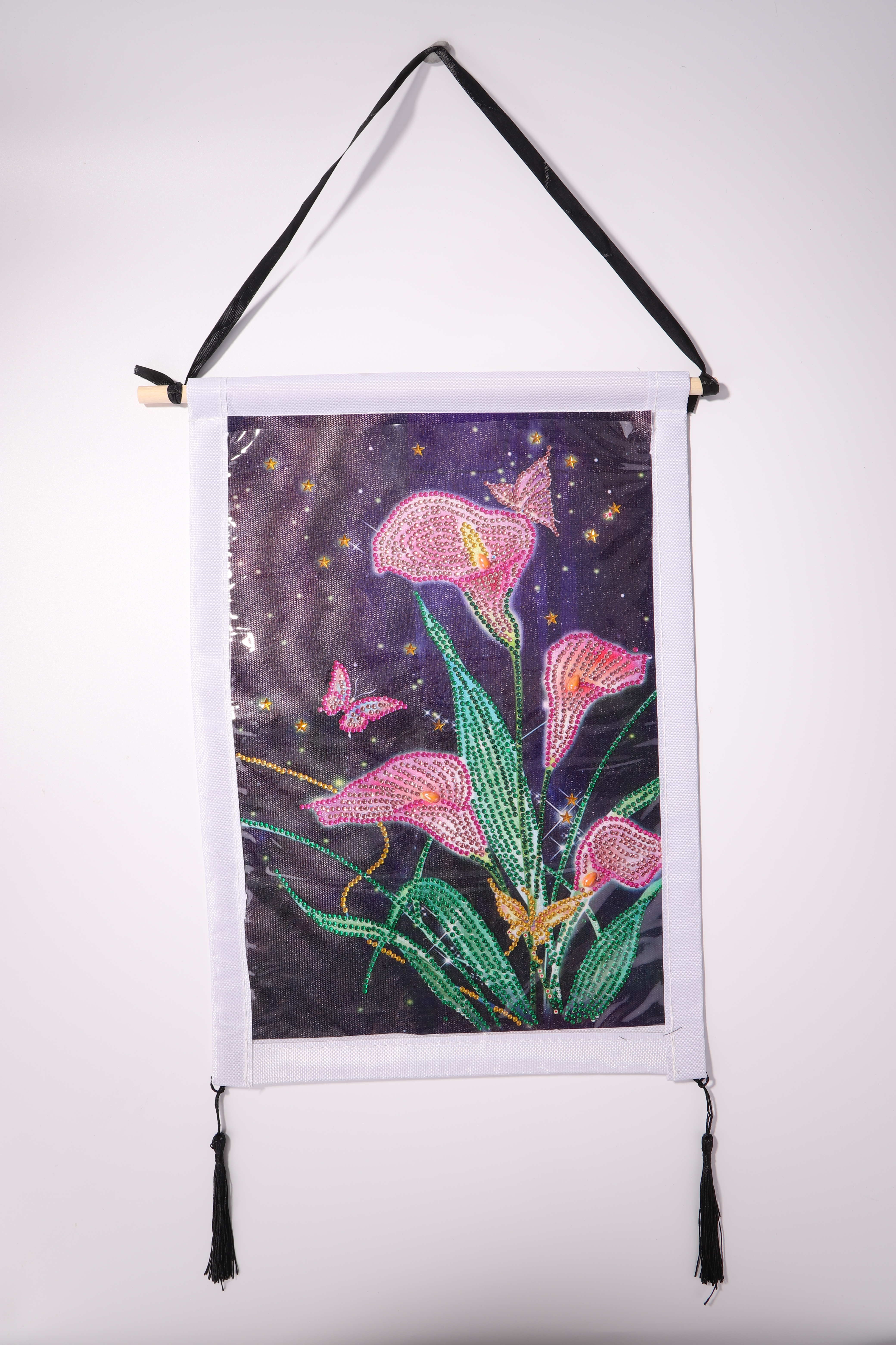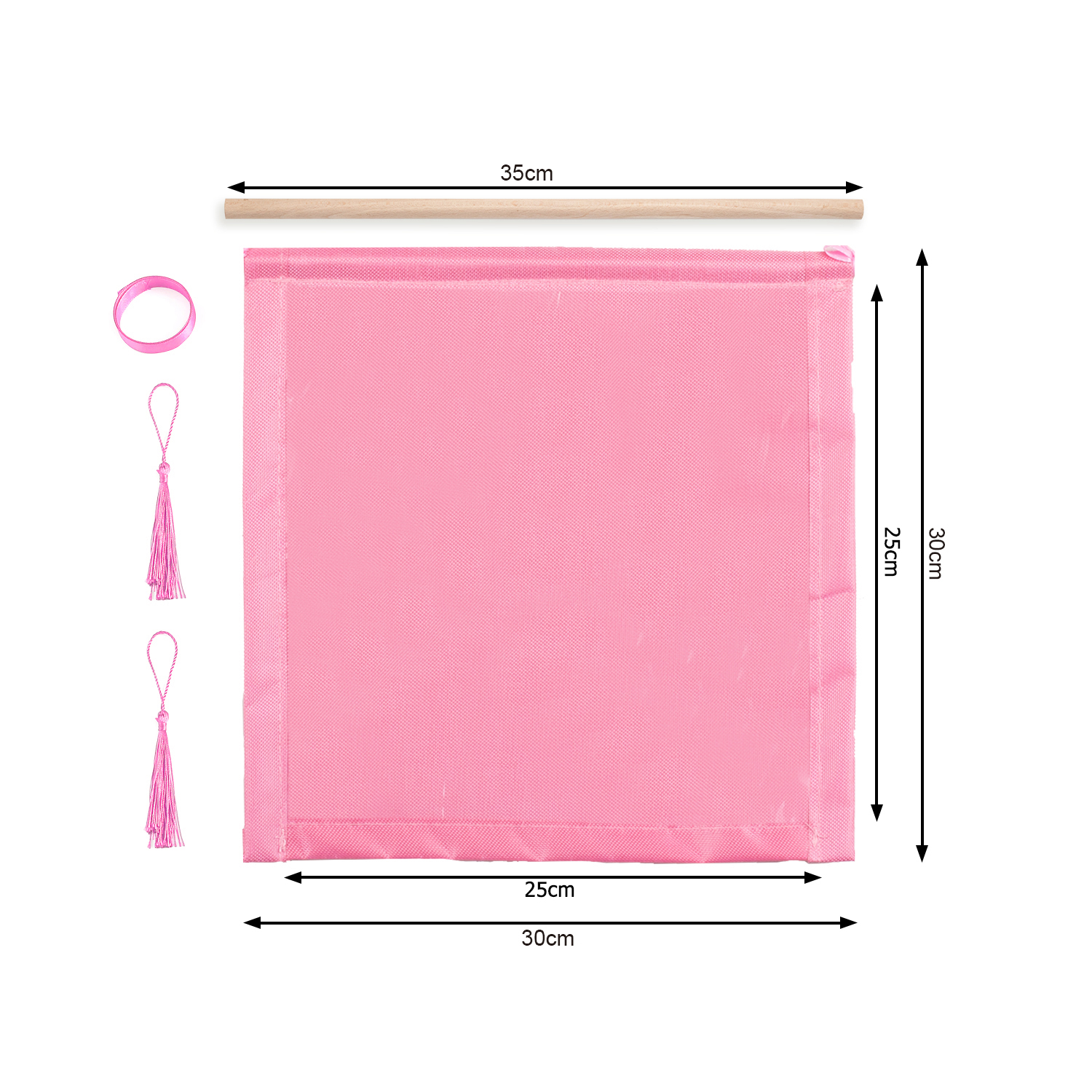 You only need to insert the wooden sticks into the hanger, fix the long ribbon on the two sides of the wooden stick, and fix the hanging ears on the two corners below the hanger.